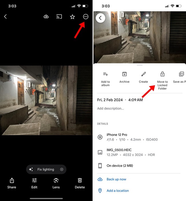 7. Sie können Fotos auch direkt in der Google Photos -App verschieben. Öffnen Sie dafür das Foto, das Sie bewegen möchten, und tippen Sie aufDrei Punkte> In den verschlossenen Ordner verschieben.